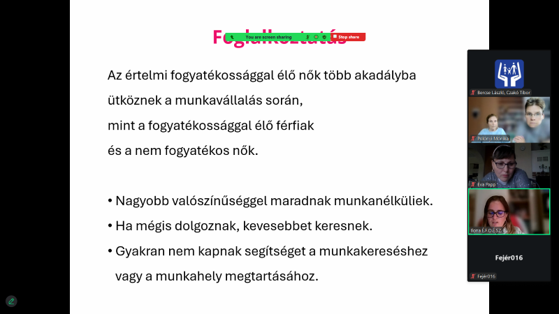 Sallai Ilona, az ÉFOÉSZ érdekvédelmi tanácsadója az Inclusion Europe friss jelentése alapján mutatta be az értelmi fogyatékossággal élő nők helyzettét Európában. Érintettként a saját tapasztalatairól is beszámolt. Elmondta, hogy az értelmi fogyatékossággal élő nők többszörös diszkriminációval szembesülünk az élet több területén.