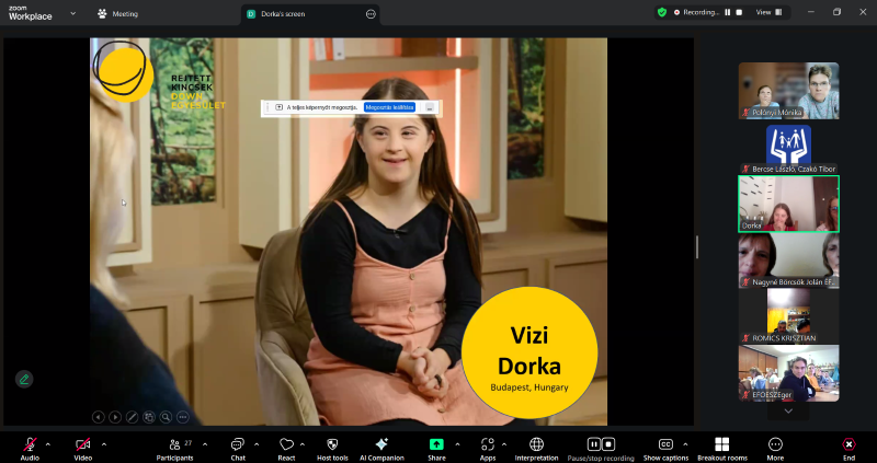Vizi Dorka önérvényesítő tréner, a Rejtett Kincsek Down Egyesület munkatársa. Önérvényesítő tanfolyamokat vezet, hogy segítsen más fiatalokat az érdekérvényesítésben. Dorka az EU for Trisomy 21című projektben vált trénerré. A projektben 10 országból, összesen 130 fiatalt képeztek ki. Azóta két képzést is tartott, de szerepelt már rádióban és tévében is. „Már tudom, hogyan kell egy beszédet összerakni, és hogyan tudok kiállni magamért. nem féltem, bátran szerepeltem” – osztotta meg a hallgatósággal.